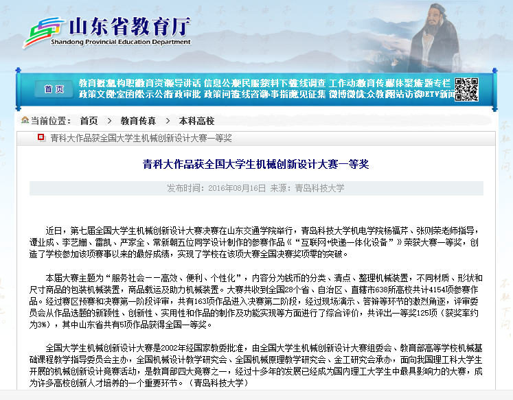 近日,第七届全国大学生机械创新设计大赛决赛在山东交通学院举行,我校澳门十大信誉好的网站杨福芹、张泽荣老师指导,谭业成、李艺姗、雷凯、严家全、常新朝五位同学设计制作的参赛作品《“互联网+快…