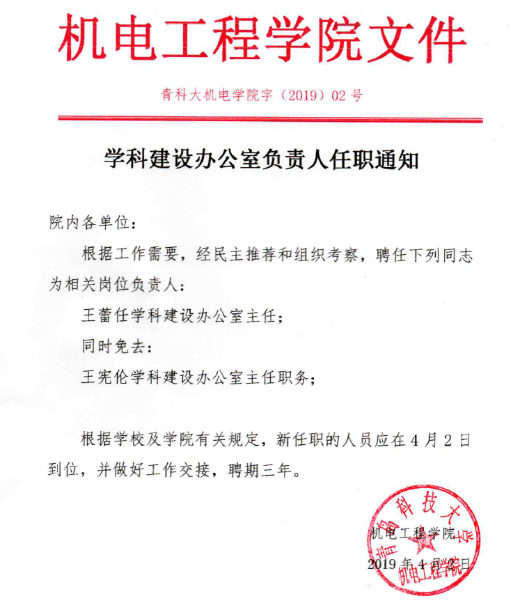 学科建设办公室负责人任职通知