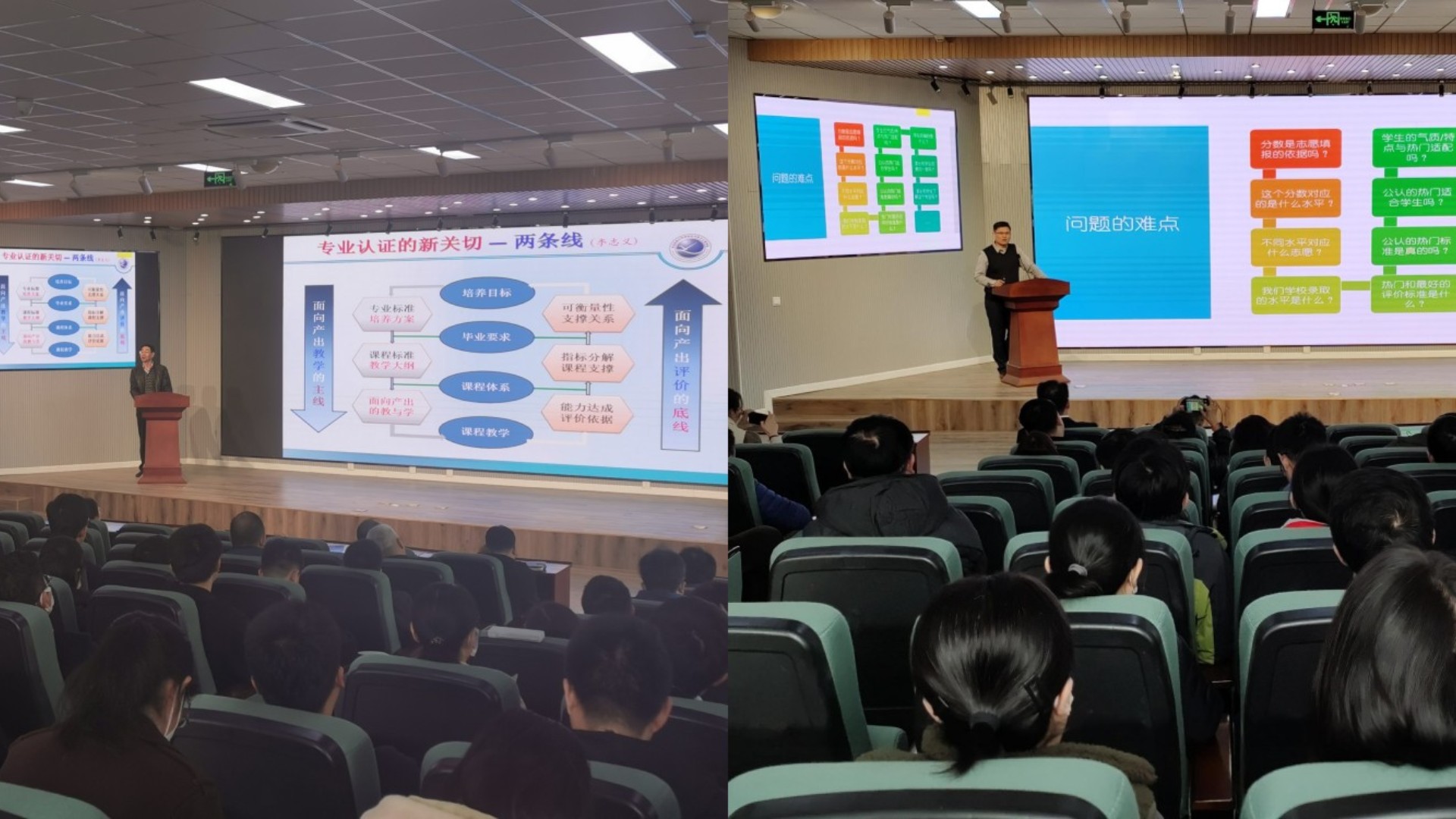 学院邀请教务处副处长徐立勋做《新高考改革后本科志愿填报咨询指南》的专题报告,强化招生宣传。以大数据展示招生的全部流程和历年录取情况,以及考生和家长的关注点。还邀请自动化学院副院长刘慧明做《如何做好认证准备工作》的专题报告,推进专业内涵建设,澄清专业建设推进中的误区,使一线教师明确如何立足自我,规范课程建设和教学活动,守好责任田,认同认证理念,推动一流专业规范化建设。
