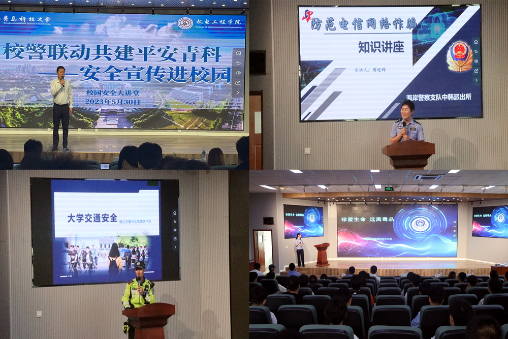 崂山交警大队风景区中队、崂山禁毒大队干警以及驻校民警围绕交通安全、大学生常见交通违法、毒品种类及危害、电信网络诈骗等方面进行了宣讲,并同与会师生进行了交流互动。