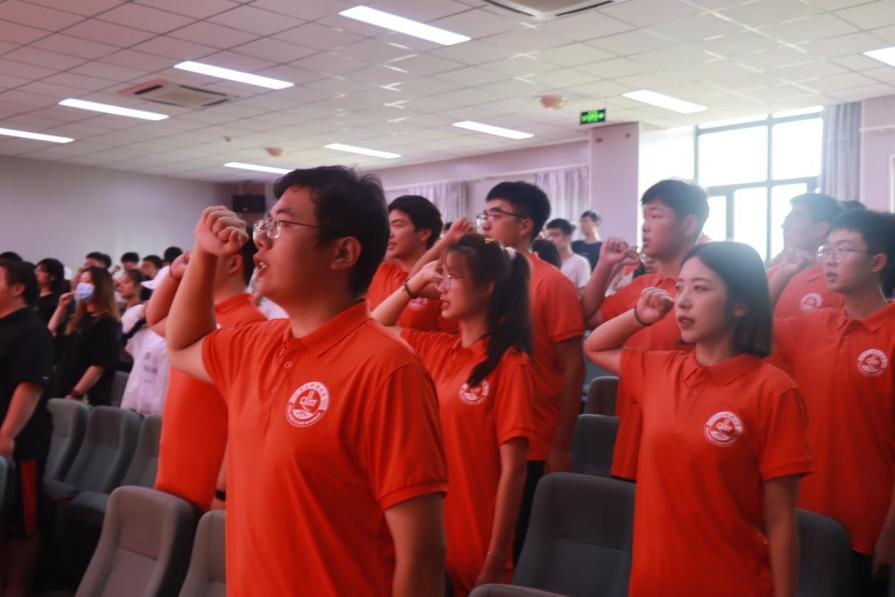 指导老师为团中央专项、校级重点团队代表授旗。志愿者代表、机械212班团支书李承飞带领与会志愿者宣誓。