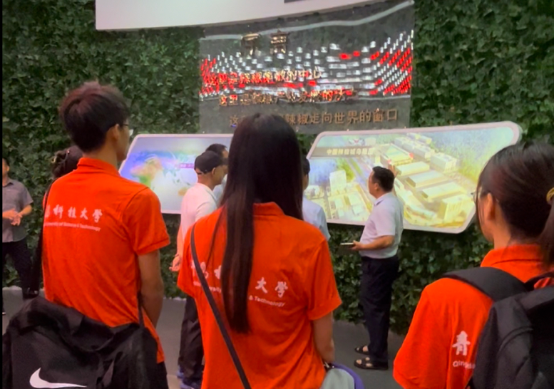 调研团的成员们来到中国辣椒城的接待中心,与企业的团委书记吴书记进行对接,吴书记十分热情的领着团队来到了中国辣椒城的数字展厅,通过看展示墙、有关辣椒发源、发展的视频、辣椒城产业园区的规划模型,了解了辣椒城“生态黔椒,泉涌天下”的理念,了解到辣椒走出贵州,面向全国,走向世界的决心,使我团队对辣椒城的产业及发展有了更近一步的了解。
