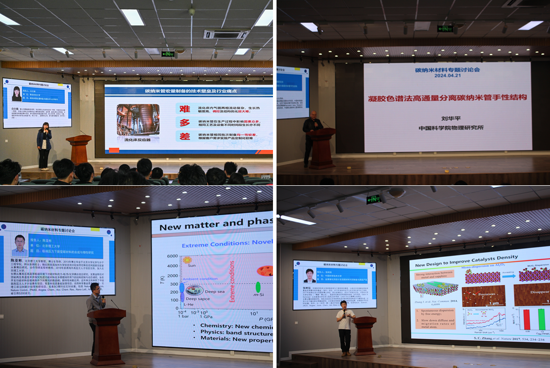 下午刘华平研究员分享了其团队在凝胶色谱法高通量分离碳纳米管手性结构方面的研究进展,分离产量达到了毫克量级,为其产业化制备奠定了技术基础;张树辰教授针对如何实现碳氢小分子高效热解这一难题,设计开发了高性能金属碳化物催化剂;陈召龙研究员通过甚高温生长策略,探讨了蓝宝石晶圆衬底上石墨烯的生长行为及高性能器件构筑;陈亚彬教授分享了在极端压力下新型碳材料的合成与物性研究方面的研究进展,利用双面激光加热系统,石墨烯、碳纳米管和碳纳米笼等传统碳结构能够非可逆地转变为新型的超薄金刚石;胡悦教授针对单壁碳纳米管的阵列密度与半导体选择性限制其在纳电子学领域应用这一问题,提出相应解决方法实现了单壁碳纳米管的精准合成与应用;张峰副研究员以浮动催化剂化学气相沉积方法制备了高质量、自支撑单壁碳纳米管薄膜,在功能增强复合材料和能量存储与转换等领域具有广泛的应用前景;张永毅研究员介绍了其团队多年来在碳纳米管纤维批量化制造方面的研究进展,成功实现纤维丝束批量化生产,并研制出一套成熟的碳纳米管纤维丝束强化工艺与设备。