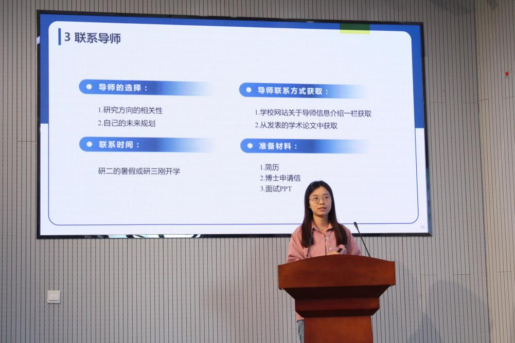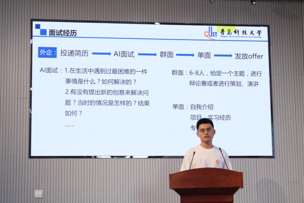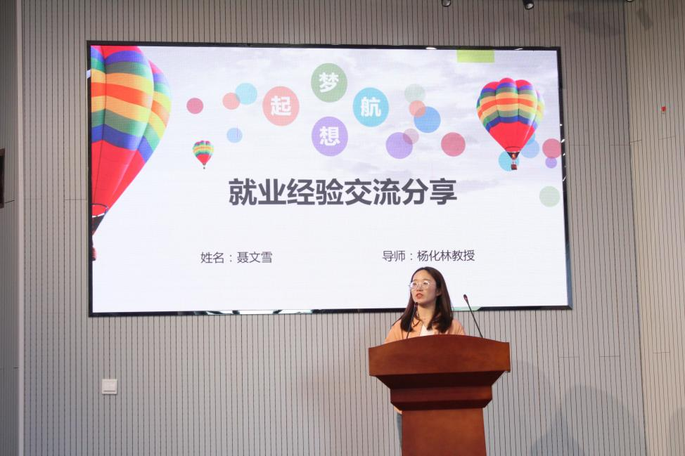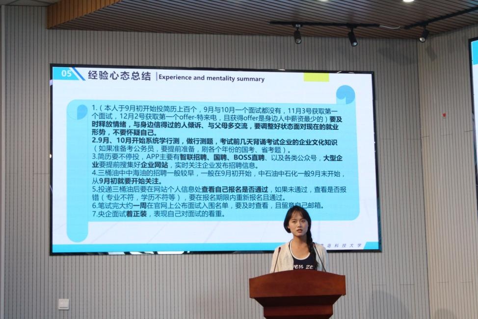 聂文雪,已成功签约济钢集团有限公司,她介绍了自己研究生三年期间的个人成果,鼓励同学们在校期间学习各类技能,同时对求职简历的制作与投递给出建议,并总结分享了自己面试过程中所用到的面试技巧。