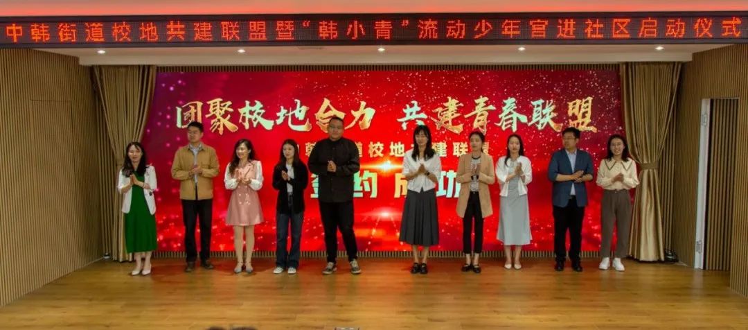 会上,学院与中韩街道举行了校地共建签约仪式和揭牌仪式,讲解了“韩小青”流动少年宫项目,打造传统文化类、指尖文创类、腹有诗书类、艺术熏陶类、动感科技类、青春导航类形体礼仪类、法制宣传类、安全自护类少年宫课程,并对青年志愿者代表授予“韩小青”流动少年宫进社区青年服务队出征旗。