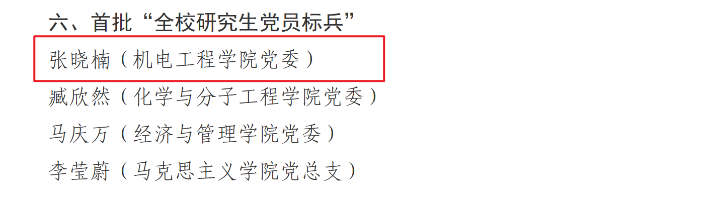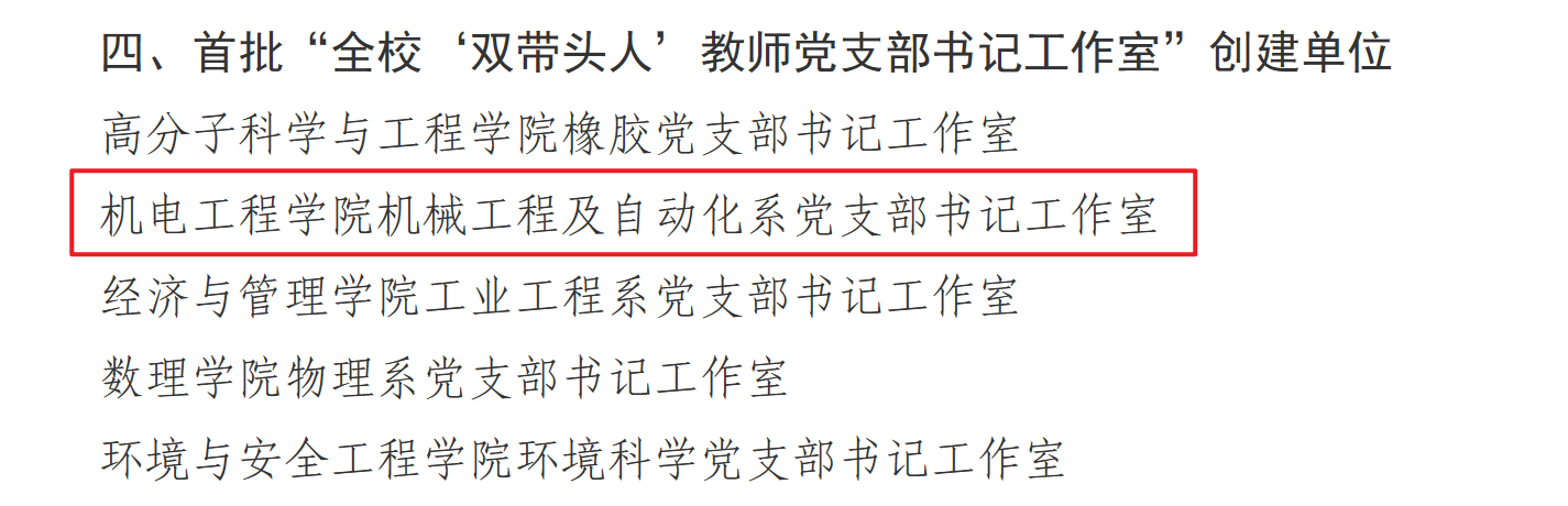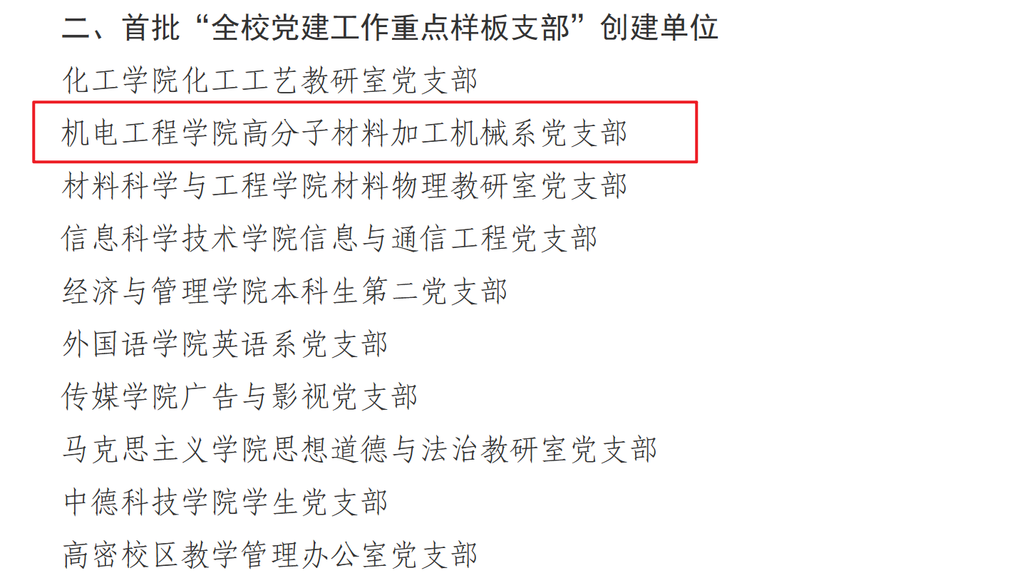 澳门十大信誉好的网站党委荣获多项佳绩,其中,学院党委入选首批“全校党建工作标杆院系”创建单位,高分子材料加工机械系党支部入选首批“全校党建工作重点样板支部”创建单位,机械工程及自动化系党支部书记工作室入选首批“全校‘双带头人’教师党支部书记工作室”创建单位,2022级硕士研究生张晓楠入选首批“全校研究生党员标兵”。