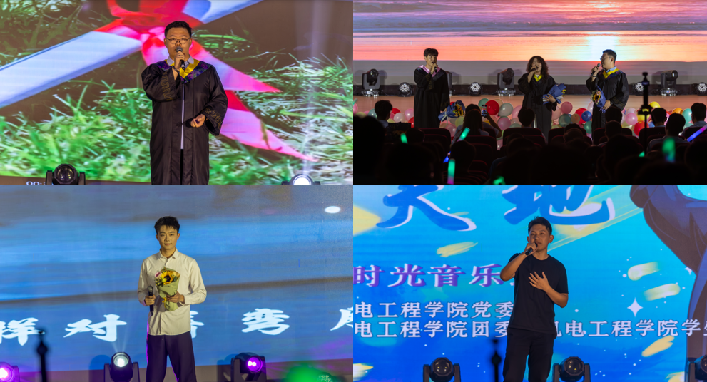 《海阔天空》以激昂旋律拉开帷幕,传递着对广阔未来的憧憬,鼓励机电学子勇敢奔赴理想;歌曲串烧《稻香》《起风了》《老男孩》用熟悉旋律串联青春片段,唤起校园里的青涩热忱与逐梦初心;《梨花又开放》《有没有一首歌会让你想起我》借歌声诉说青春里的思念与共鸣,开启这场青春与梦想交织的音乐之旅《像风一样》用灵动节奏诠释青春的自由与洒脱,激励毕业生无畏前行;《知足》以温暖和声传递对校园岁月的珍视,感恩奋斗路上的收获;《裂缝中的阳光》唱出困境中坚守的力量,希望机电学子能够披荆斩棘、追逐理想;团委老师集体朗诵《那年,那时光——守望者的告白》,用深情话语诉说陪伴与期许,见证学子们在磨砺中成长担当;《入海》,唱出青春散场、奔赴新途的壮志,祝愿毕业生们在人生的海洋中乘风破浪;《不说再见》以不舍旋律留存校园情谊,道尽对四年相伴的眷恋;《我们好像在哪见过》借歌声打捞青春里的美好遇见;《陪你度过漫长岁月》用温暖的嗓音回顾青春同行的珍贵;最后,全体演职人员合唱《凤凰花开的路口》,在熟悉的旋律中回首韶华,用歌声祝福毕业生前程似锦、一路繁花。