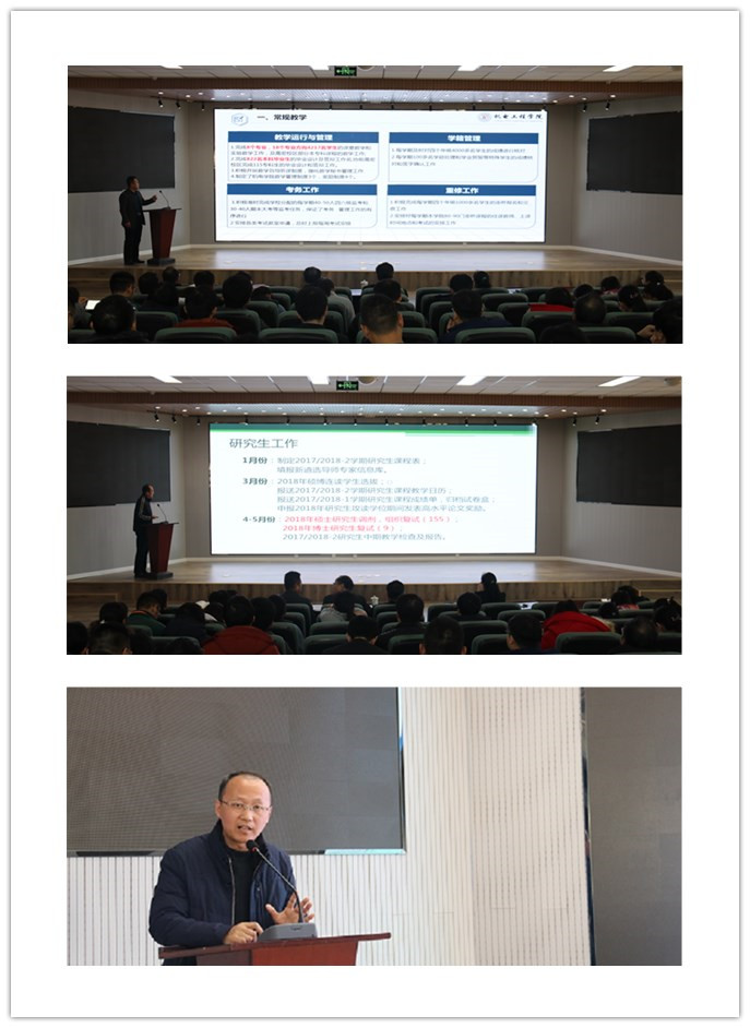 何燕从学院的发展方略、发展构想、发展策略三大方面进行了报告。提出要以智能制造为统领,推动学院专业建设和学科发展。学科建设要做大一级学科博士点,重点扶持二级学科硕士点的建设,为申请一级学科硕士点积聚力量,加大新学科增长点的培育力度。专业建设方面要加强专业的建设,重点发展两个方向,由此带动其他专业发展,整合资源,重塑两个本科专业,紧跟时代步伐,对其他专业实时进行调整。在未来的学院发展策略上,要寻求新增长点,搭建平台;组建大科研团队,运筹大项目,加强科研团队培养;加强对外交流,扩大影响力;加强人才队伍建设;完善规章制度,加强内部管理。并从专业建设、学科建设方面提出了2019年的工作重点。