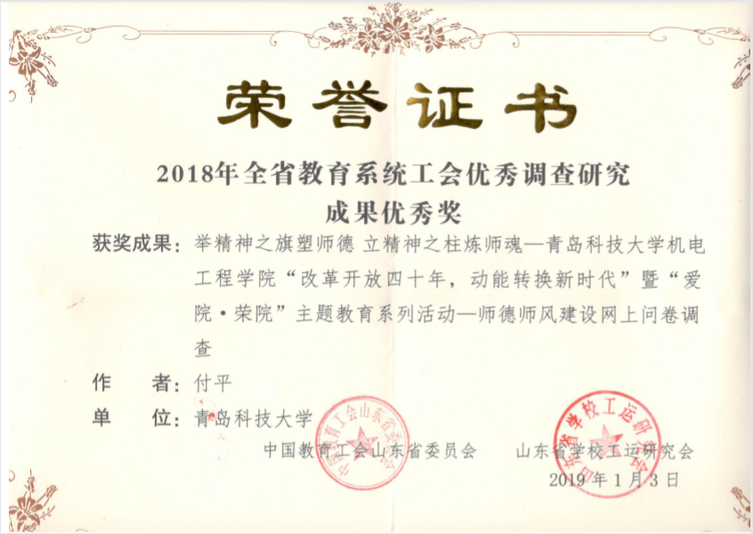 近日,澳门十大信誉分工会付平老师结合我院工会工作实际,所申报的《举精神之旗塑师德 立精神支柱炼师魂---澳门十大信誉好的网站“改革开放四十周年,动能转换新时代”暨“爱院·荣院”主题教育系列活动---师德师风建设网上问卷调查》在全省100多项作品中脱颖而出,获得2018年全省教育系统工会优秀调查研究成果优秀奖。