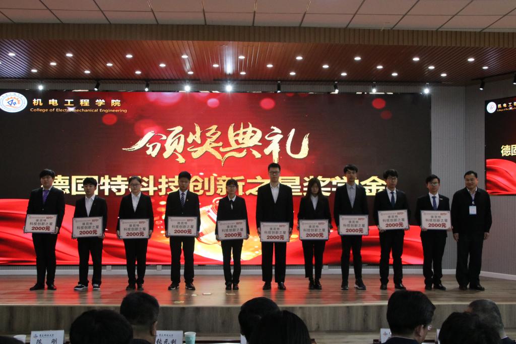 在昂扬的校歌中,陈刚处长、王锋业书记、何燕院长、魏振文董事长、崔建波副总经理分别给获得德固特学业优秀奖学金、德固特科创新秀奖学金同学颁奖。毕岚森同学作为学生代表进行了发言。