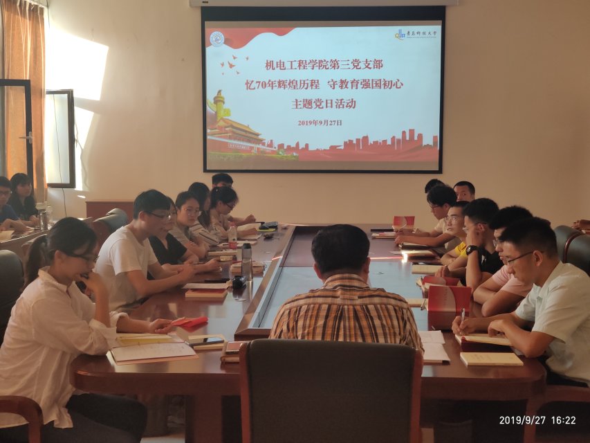 为贯彻澳门十大信誉好的网站召开“不忘初心、牢记使命”主题教育工作会议精神、贯彻校组织部关于党支部组织生活指导意见,在中华人民共和国成立70周年到来之际,充分发挥党员的榜样示范作用,营造爱国氛围、凝聚奋进力量,引领广大师生继承和发扬爱国主义精神,不断提升党的凝聚力和引领力。9月27日,澳门十大信誉好的网站第三党支部在澳门十大信誉518会议室举行“忆70年辉煌历程 守教育强国初心”主题党日活动。第三党支部全体党员参加了活动,活动由党支部书记王作辉主持。