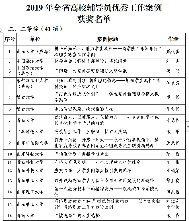 据悉,此次评选是为深入学习贯彻习近平新时代中国特色社会主义思想,全面落实全国、全省教育大会和高校思想政治工作会议精神,切实加强我省高校辅导员队伍专业化、职业化建设,根据《中共山东省委教育工委关于开展全省高校辅导员2019年度优秀工作案例评选的通知》(鲁教工委函〔2020〕6号)要求,经学校推荐、专家评审等程序,最终研究确定160项优秀工作案例。