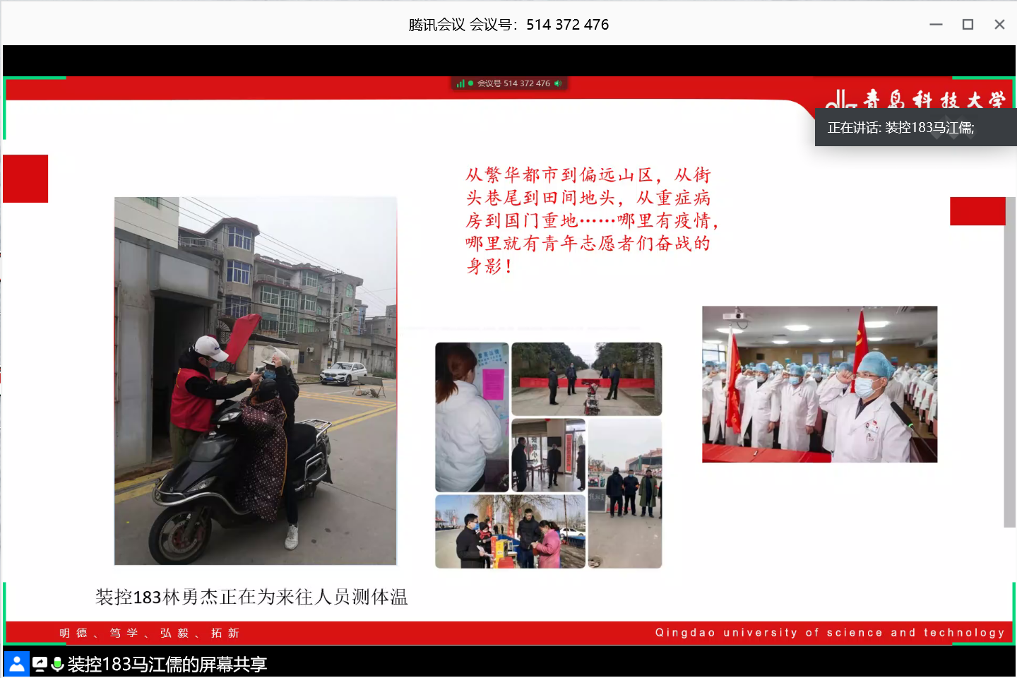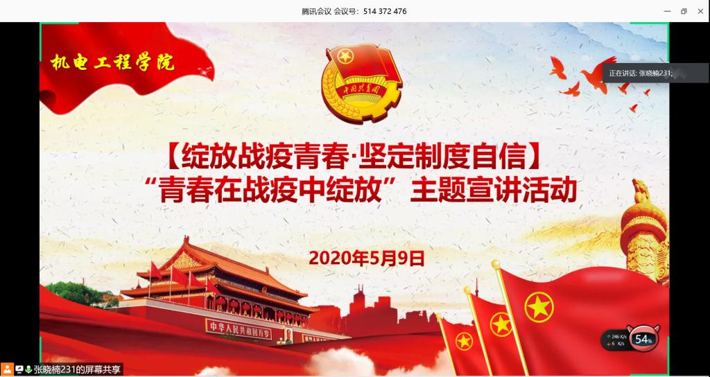 为深入贯彻落实习近平新时代中国特色社会主义思想对青年行动的指导,5月9日,在纪念五四运动101周年、新冠疫情防控阻击战取得重大战略成果之际,澳门十大信誉分团委组织部举办“青春在战疫中绽放”线上主题宣讲活动。分团委组织部部长王娟娟老师出席了活动,罗浩宇、刘龙、马江儒和马元宇四位团员作为机电团员青年战疫典型代表宣讲了他们勇战疫情的青春故事,17级、18级、19级200余名团学骨干通过“腾讯会议”参与了活动。活动由分团委组织部副部长张晓楠主持。