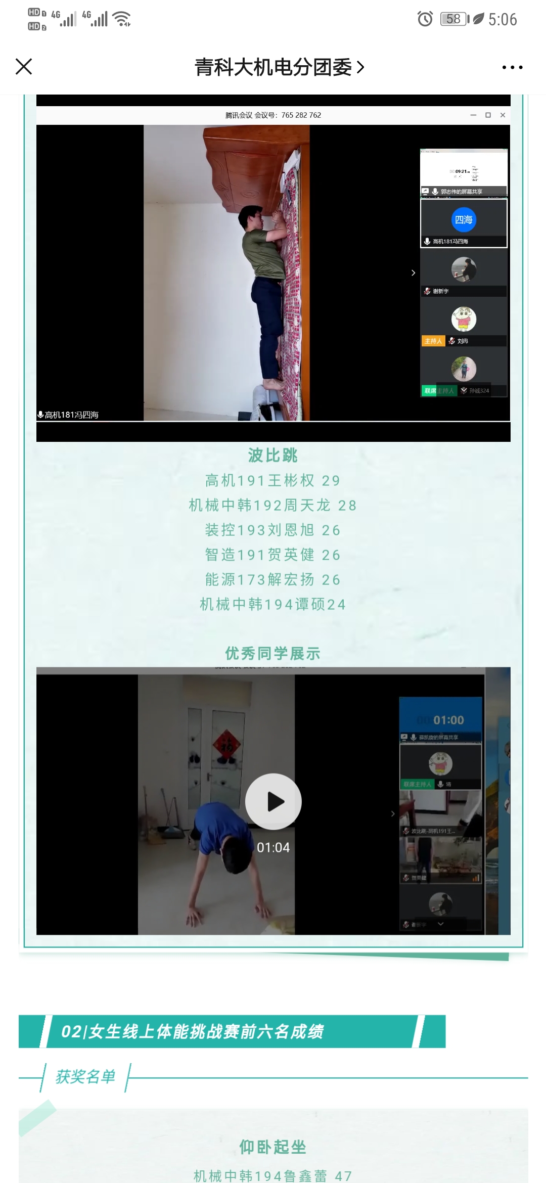 为了响应山东省教育厅和学校关于“线上教育要重视学生心理健康”的工作要求,帮助学生缓解焦虑情绪,活跃学生居家锻炼氛围,澳门十大信誉举办了“莘莘学子共庆七十华诞,矫健英姿同战疫疠瘟情”线上体能挑战赛。比赛分男子组和女子组,男子组项目有一分钟俯卧撑、一分钟波比跳、平板支撑;女子组项目有一分钟仰卧起坐、一分钟开合跳、平板支撑,活动中,选手们在家运动,线上比赛,不断强健学子体魄。