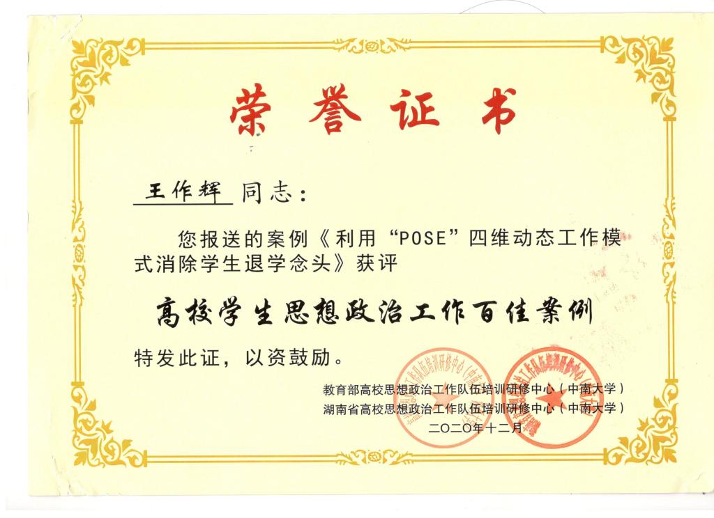 近日,教育部高校思想政治工作队伍培训研修中心(中南大学)公布了2020年高校学生思想政治工作百佳案例的遴选结果。由澳门十大信誉学工办主任兼团委书记王作辉申报的《利用“POSE”四维动态工作模式消除学生退学念头》成功入选《高校学生思想政治工作百佳案例》。
