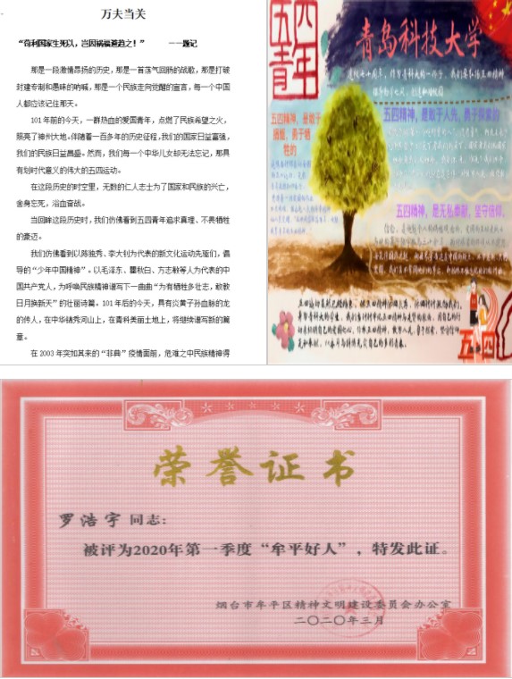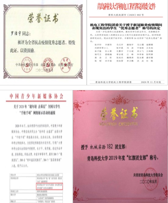 ■新冠肺炎疫情发生以来,来自各行各业的志愿者活跃在疫情防控第一线,新冠肺炎疫情发生以来,机电学子为疫情防控作出极大贡献,罗浩宇荣获山东省大学生“青春贡献奖”,并被授予“牟平好人”和山东省抗疫优秀志愿者称号,耿宇轩荣获团中央暑期三下乡“千校千项”最美团队