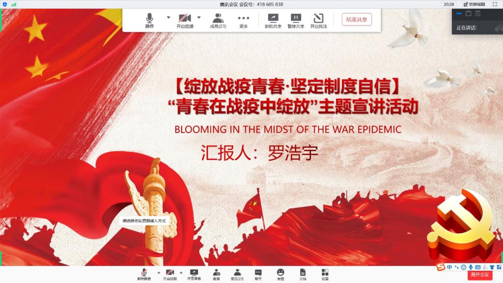 随后罗浩宇同学向我们分享了自己在疫情期间的志愿工作经历,指出学生党员是社会主义的后备力量,应该克服焦虑、害怕,勇于承担一名党员的责任,为社会贡献自己的一份力量,分享过后与支部同志进行了短暂交流,大家收获颇丰。