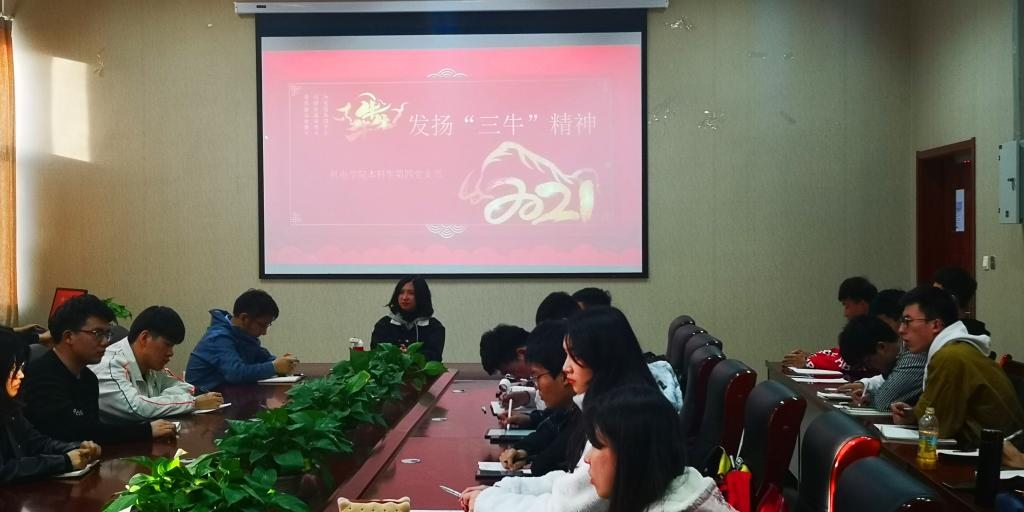 3月23日,结合习近平总书记日前在全国政协新年茶话会上的讲话精神,澳门十大信誉本科生第四党支部召开“发扬”三牛”精神,凝心聚力干事,全面开创学校高质量发展新局面”主题党日活动。会议由党支部书记孙坤岩主持。