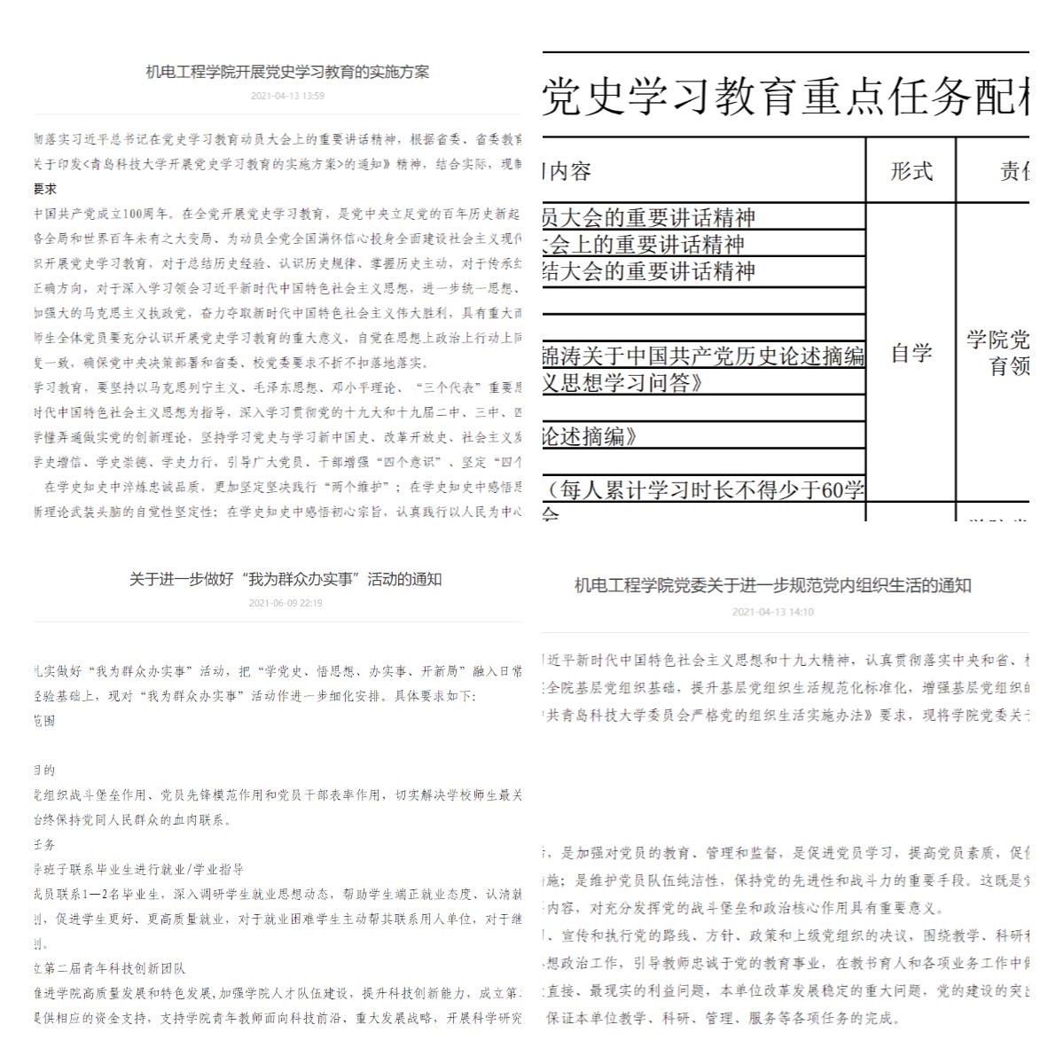 自党史学习教育开展以来,澳门十大信誉党委坚持把其作为重要政治任务,认真贯彻落实有关决策部署和学校工作要求,立足工作实际,坚持规定动作做到位、自选动作有特色,多措并举,扎实推进,务求取得实效,相继出台了《澳门十大信誉好的网站开展党史学习教育的实施方案》《澳门十大信誉好的网站开展党史学习教育重点任务配档表》《澳门十大信誉好的网站党委关于进一步规范党内组织生活的通知》《澳门十大信誉好的网站关于进一步做好“我为群众办实事”活动的通知》等,为学院开展党史学习教育明确了时间表、路线图、任务书,在开展党史学习教育进而迎接建党100周年过程中,学院党委始终坚持“四个联动”,扎实推动党史学习教育走深走实。