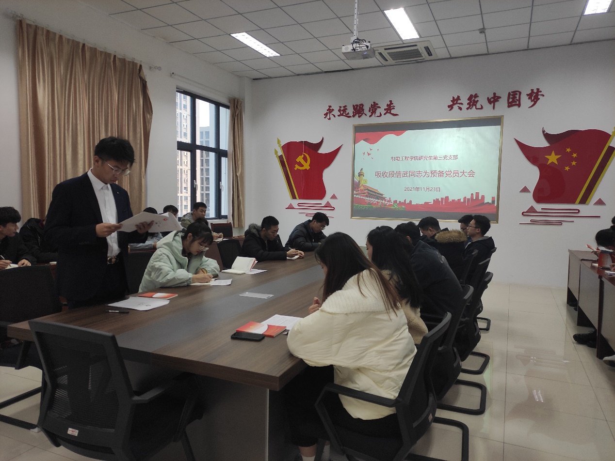 11月23日下午,澳门十大信誉好的网站研究生第三党支部在机电楼529会议室召开预备党员转正大会,支部党员全员参加会议,会议由宗萌主持。