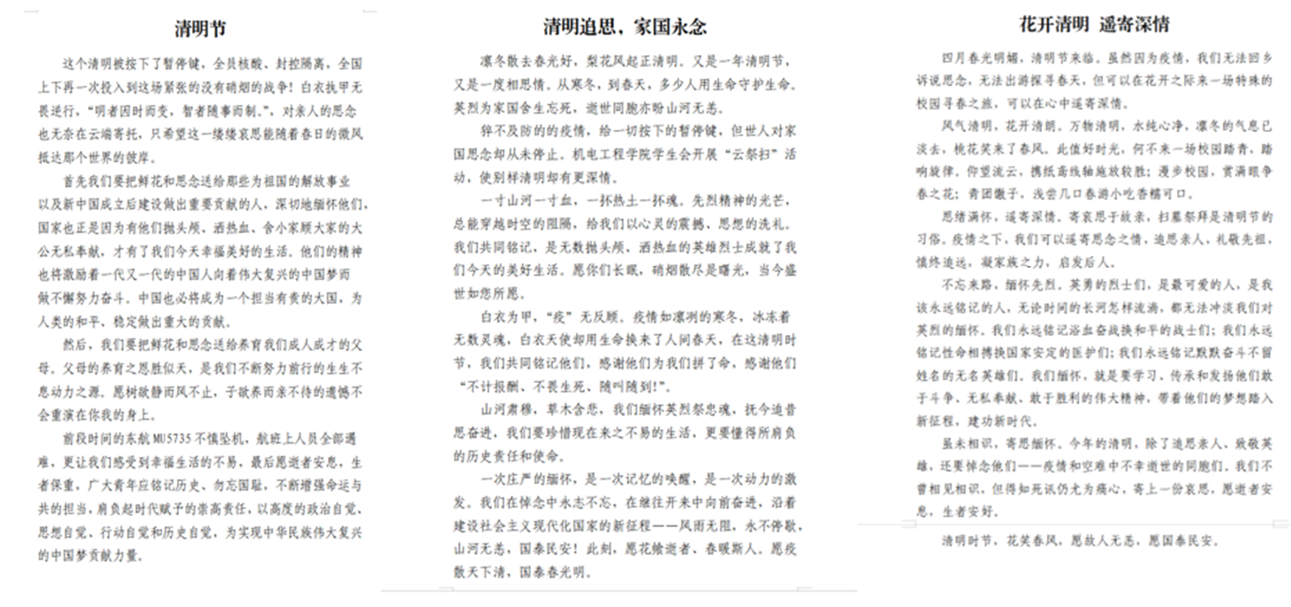 天地英雄气,千秋尚凛然——澳门十大信誉学生会开展“清明寄哀思”征文活动。组织学生们以笔寄情,与英烈对话,提高思想觉悟,坚定理想信念,汲取不畏强敌、不畏风险、敢于斗争、奋勇向前的勇气与力量。