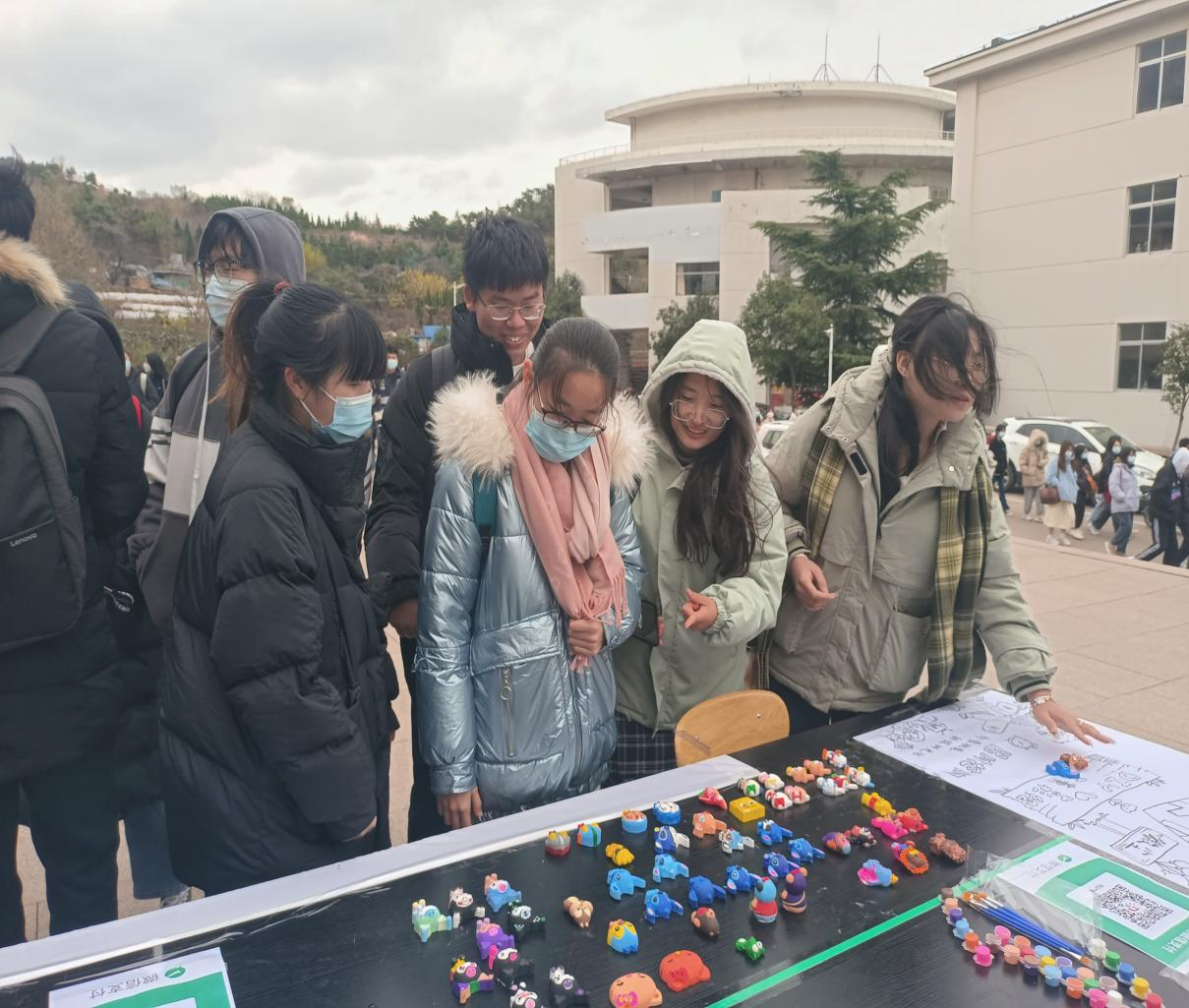 义卖活动一开始便引起了广泛关注,低温和冷风没有使大家的热情减弱,桌子四周都围满了前来献爱心的同学们,大家看着一件件精致的彩绘作品,纷纷购买,献出了属于自己的一份爱心,现场气氛热烈而温馨。此次义卖活动商品均为志愿者们前期精心创作的石膏彩绘作品,志愿者们向来往的同学们科普自闭症相关知识,呼吁大家关爱特殊儿童群体。此次志愿服务所募集善款将全部用于资助自闭症儿童,为自闭症儿童献出一份力量,带来一份温暖。