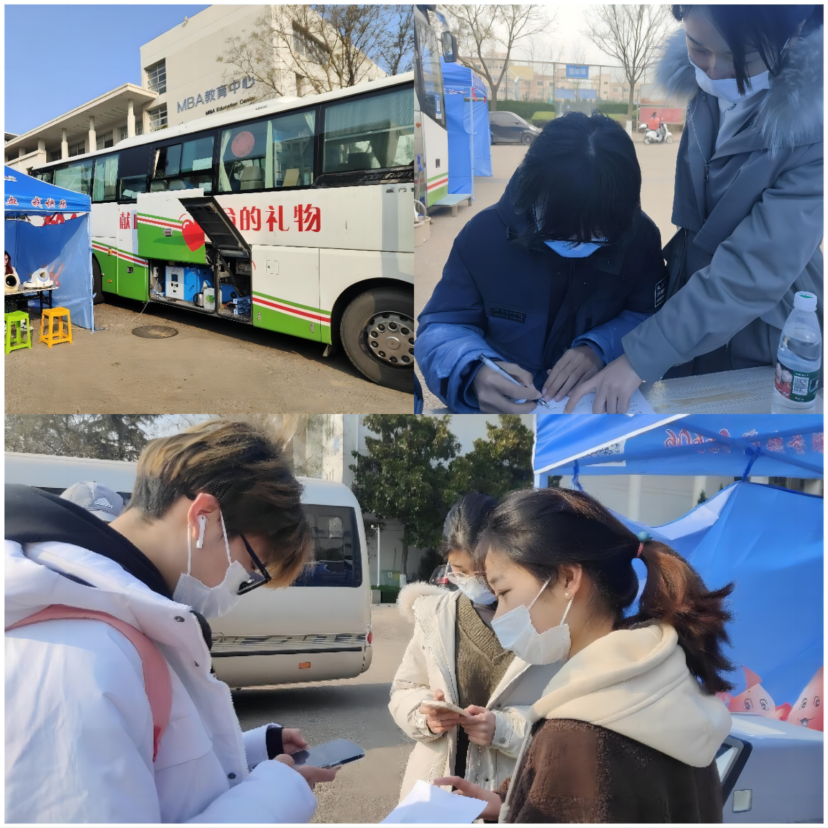 在献血车上,医护人员仔细检查每位献血者的身体状况,献血的同学们挽起衣袖,躺在采血椅上,献出自己的青春热血。志愿者们为同学们递上冒着热气的糖水,无微不至的关心令同学们倍感温暖。寒冬腊月,唯爱意,让生命之树亘古长青。