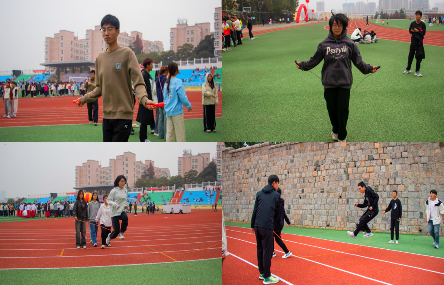 跳绳——速度与节奏的盛宴。团体赛中,同学们默契配合,时而演绎“8"字灵动舞步,于长绳间隙中翩跹穿梭;时而接力竞逐,倾尽全力,誓为集体争荣耀。绳影交织出绝美轨迹,每次腾跃如青春鼓点,激励每一位参与者奋勇向前。