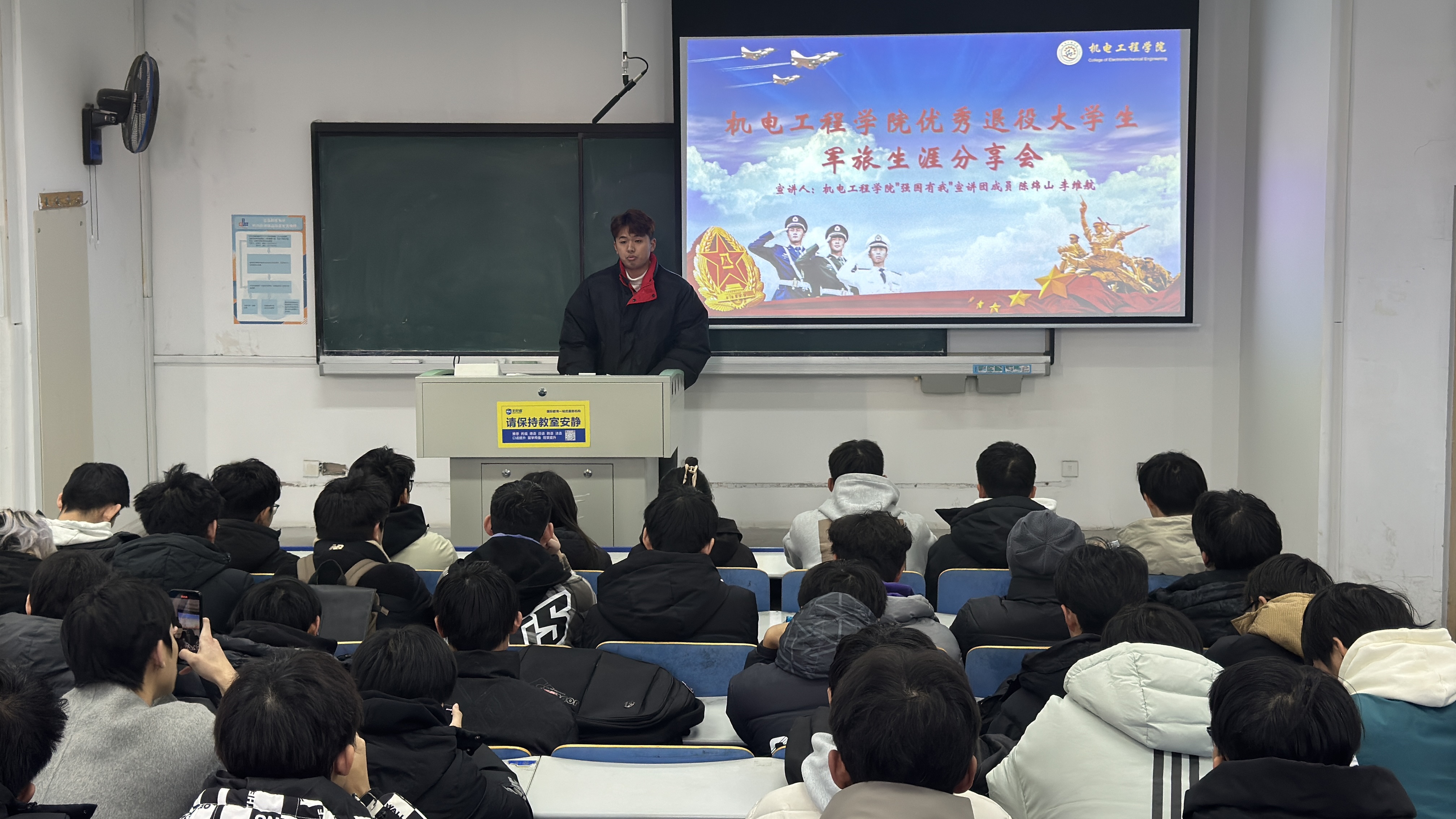 为进一步弘扬爱国主义精神,深化国防教育内涵,鼓励广大学生投身国防事业,澳门十大信誉好的网站于11月10日下午在弘毅楼E201举行了“机逐青春 智戎有我”优秀退役大学生军旅生涯分享会,澳门十大信誉好的网站“强国有我”宣讲团成员陈绵山、李维航和全院师生代表参加活动。