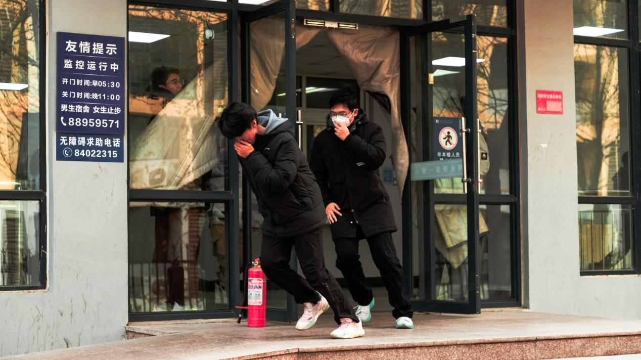 下午14时,应急疏散演练在北区学生宿舍公寓楼展开。随着警报响起,学生在疏导人员的指引下,迅速用湿毛巾捂住口鼻,沿预定路线保持低姿、有序撤出公寓,到达室外指定安全区域。整个过程响应快速、组织有序,达到了预期效果。