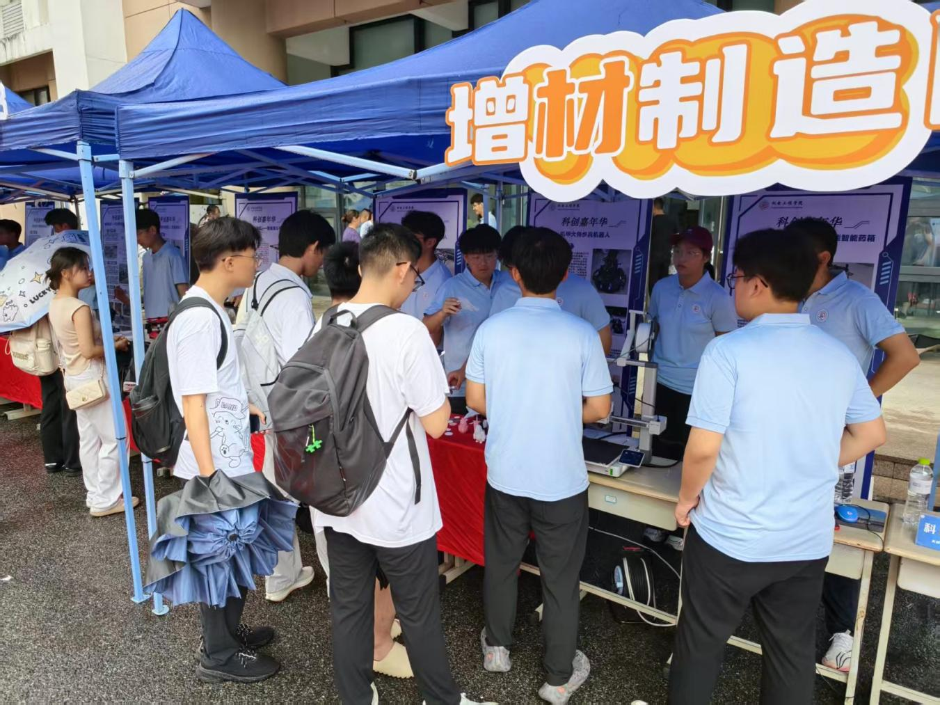 活动现场气氛热烈,各展示摊位前均聚集了众多热情高涨的师生。其中,3D 打印摊位成为全场关注的焦点,精细的哪吒模型、造型别致的创意摆件以及印有学院标识的定制徽章整齐陈列。伴随着 3D 打印机的运作声,一件件作品逐步成型,其精巧的工艺让在场师生纷纷感叹 “科技感十足”。工作人员还贴心地将部分打印成品赠予感兴趣的师生,作为活动纪念。格斗机器人展区的互动体验精彩纷呈,两台机器人灵活完成走位、出击等一系列动作,攻防转换之间尽显技术精准度,每一次精彩对抗都引得现场掌声与惊呼不断,让师生们沉浸式感受人机协作与竞技科技的独特乐趣。
