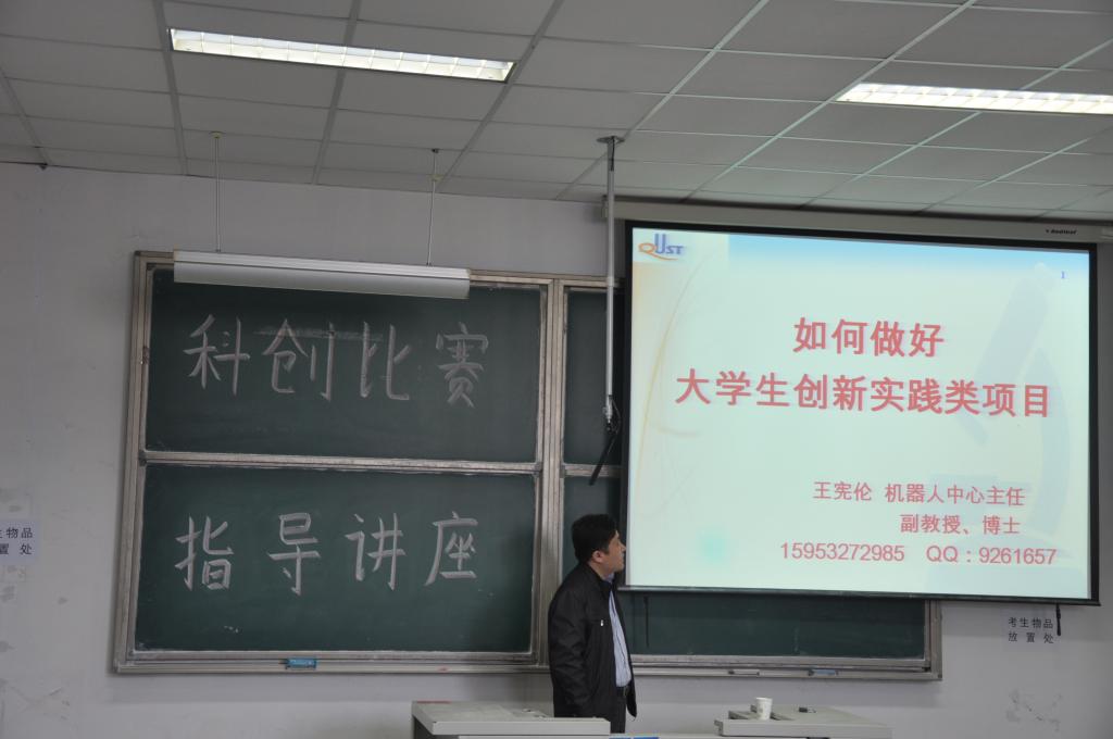 4月21日上午9:00,由澳门十大信誉科技创新协会组织举办的科创比赛指导讲座于弘毅楼E区103教室举行,澳门十大信誉机器人中心主任王宪伦亲临现场指导,讲座吸引了广大科技爱好者积极参加。