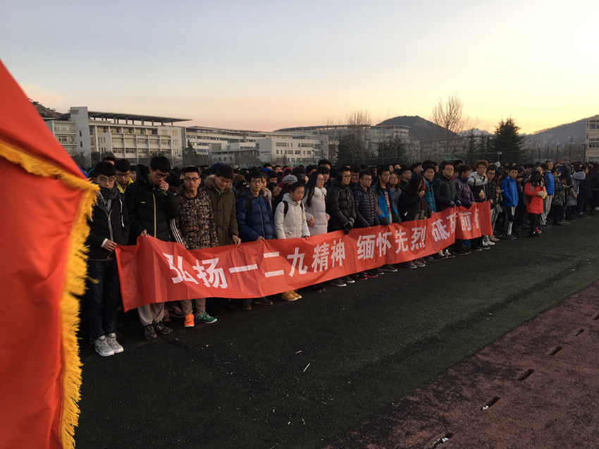 寒冷天气丝毫不影响机电学子抖擞的精神,6:50已整队完毕,静待仪式开始。七时整,伴随雄壮的《义勇军进行曲》,全场肃然,鲜艳的五星红旗冉冉升起,全体机电学子面向五星红旗行注目礼,表达了对祖国的热爱,对历史的尊重,以及对美好未来的期盼。曾经抛洒一腔热血,而今勿忘过往岁月。1935年的今天,一群爱国学子用生命为我们留下了中华儿女顽强抵御外敌入侵的爱国精神。北平学生3000余人在中国共产党的领导下举行示威游行,高呼“停止内战,一致抗日”、“打倒日本帝国主义”等口号,公开揭露日本帝国主义侵犯中国并吞并华北的阴谋,打击了国民党政府的妥协投降政策,促进了中国人民的觉醒,为推进国内抗日民族统一战线的形成发挥了重要作用。如今81年过去,全体机电学子必将以此为契机,弘扬一二九精神,缅怀先烈,砥砺前行。
