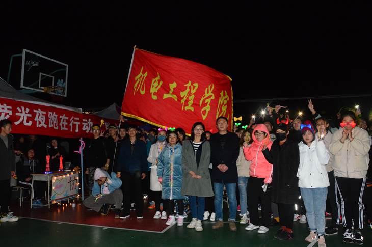 领跑者高举机电大旗在夜色中奔跑。在这60分钟内,同学们陶醉于这片安静的夜色,亲近本色的自然;在短暂的黑暗中回味静谧,反思自己的生活态度,珍惜当下。