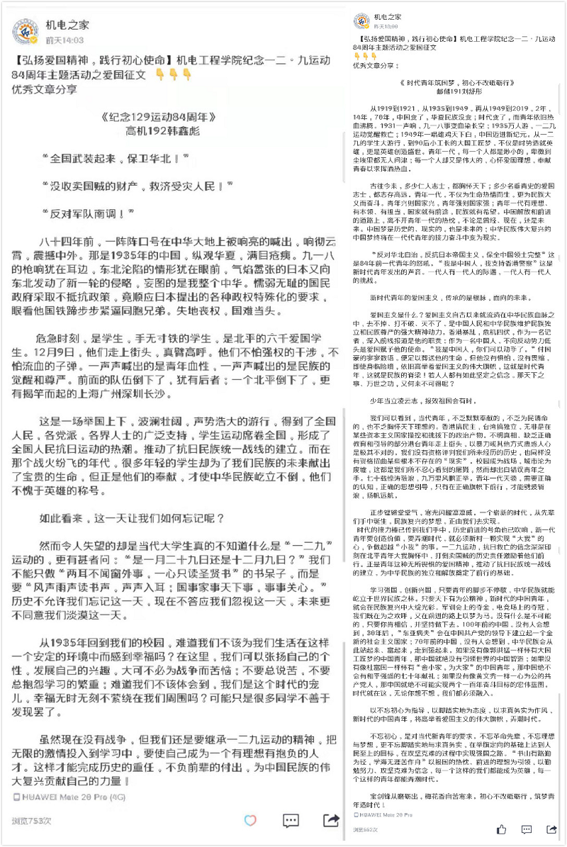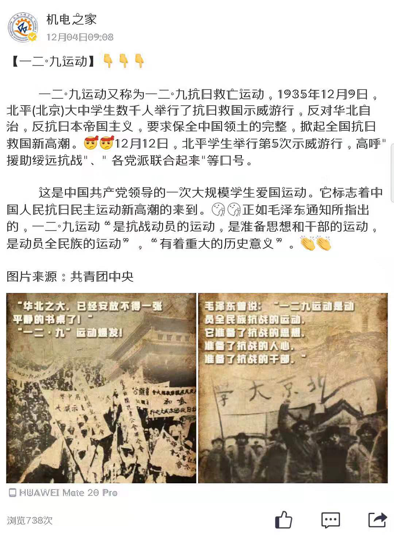 澳门十大信誉好的网站面向全体2019级青年学生开展“纪念一二•九运动”爱国主题征文活动,征文活动发出后,受到广泛且热烈的追捧,经选拔,共计五篇优秀征文脱颖而出,在学院学生会自媒体平台“机电之家”公众号上推广展示。