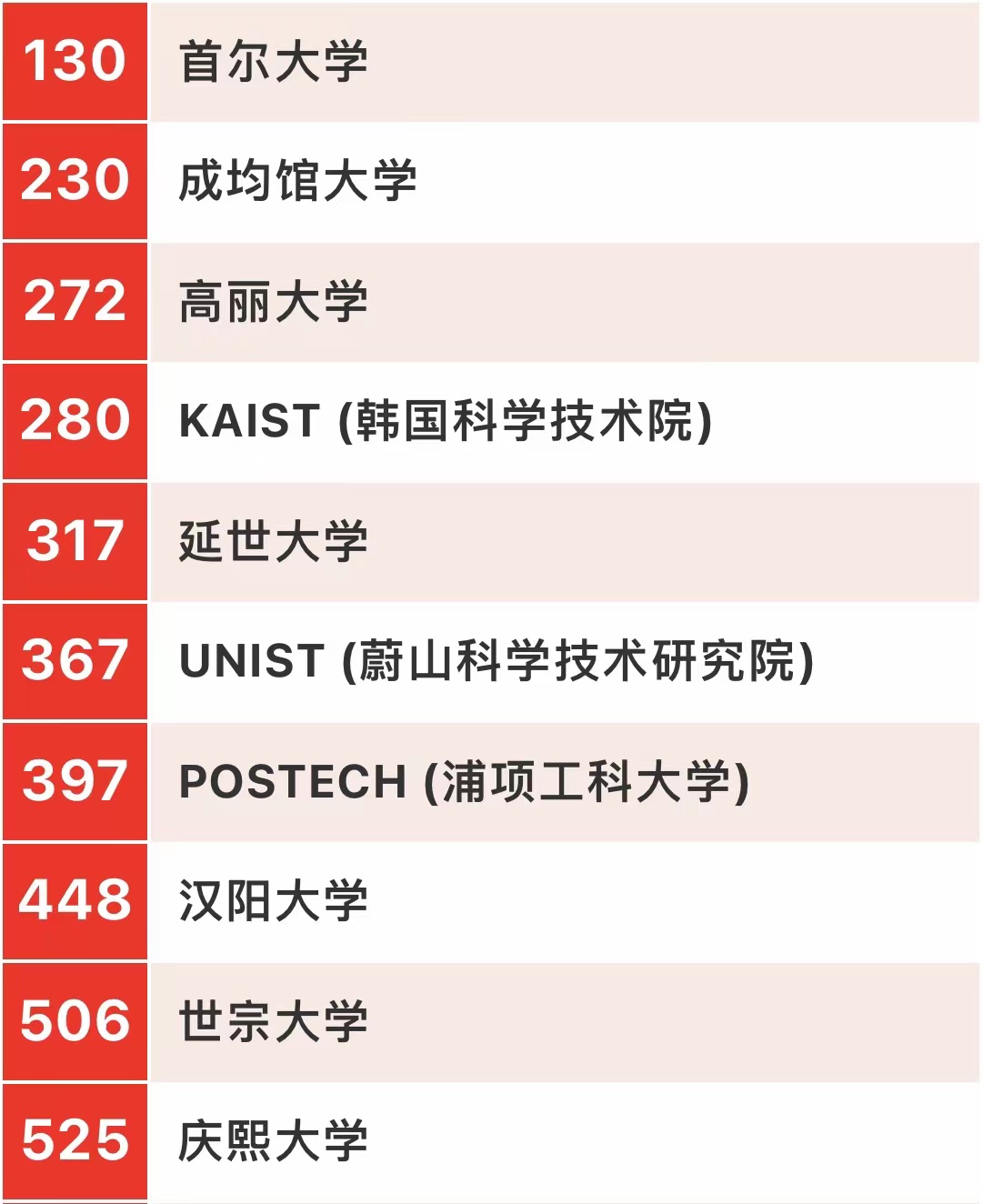下面我们来看一下韩国大学的排名情况。